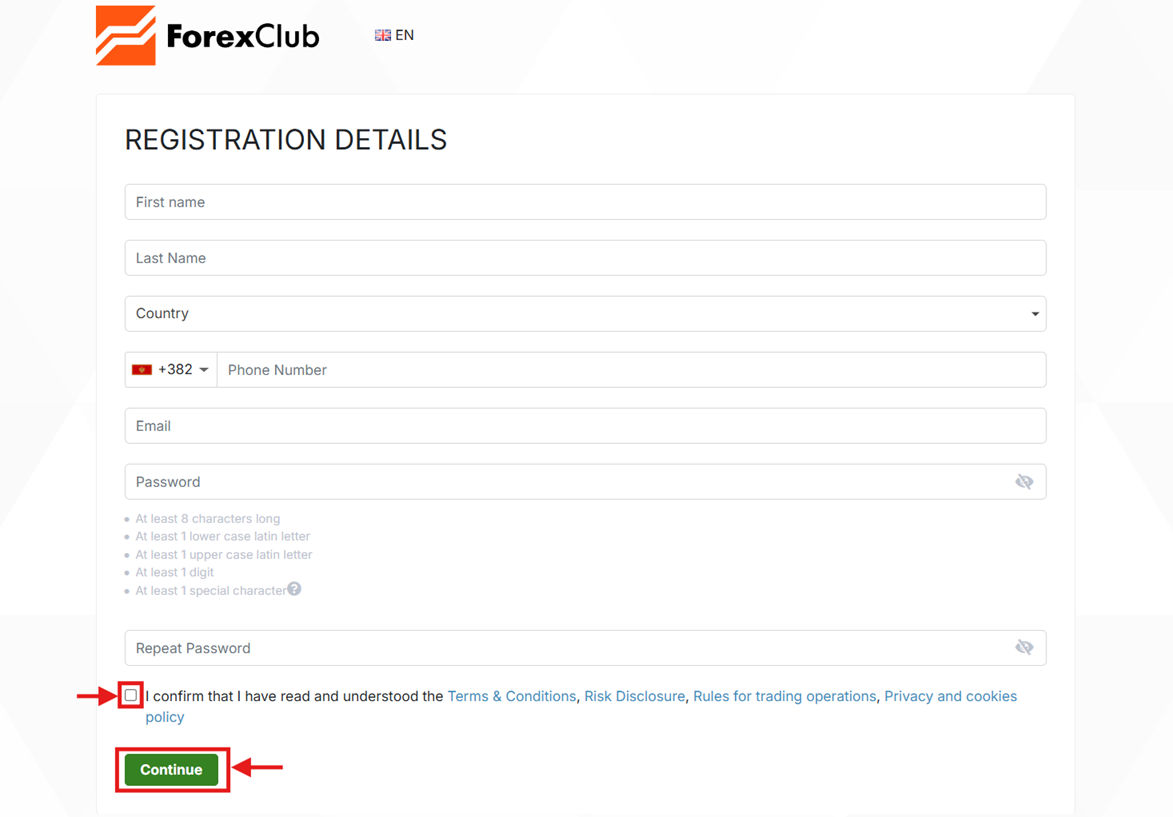 Fill in your login details, tick the box to confirm that you agree with our Terms & Conditions, Risk Disclosure, Rules for trading operations, Privacy and cookies policy, and click "Continue".